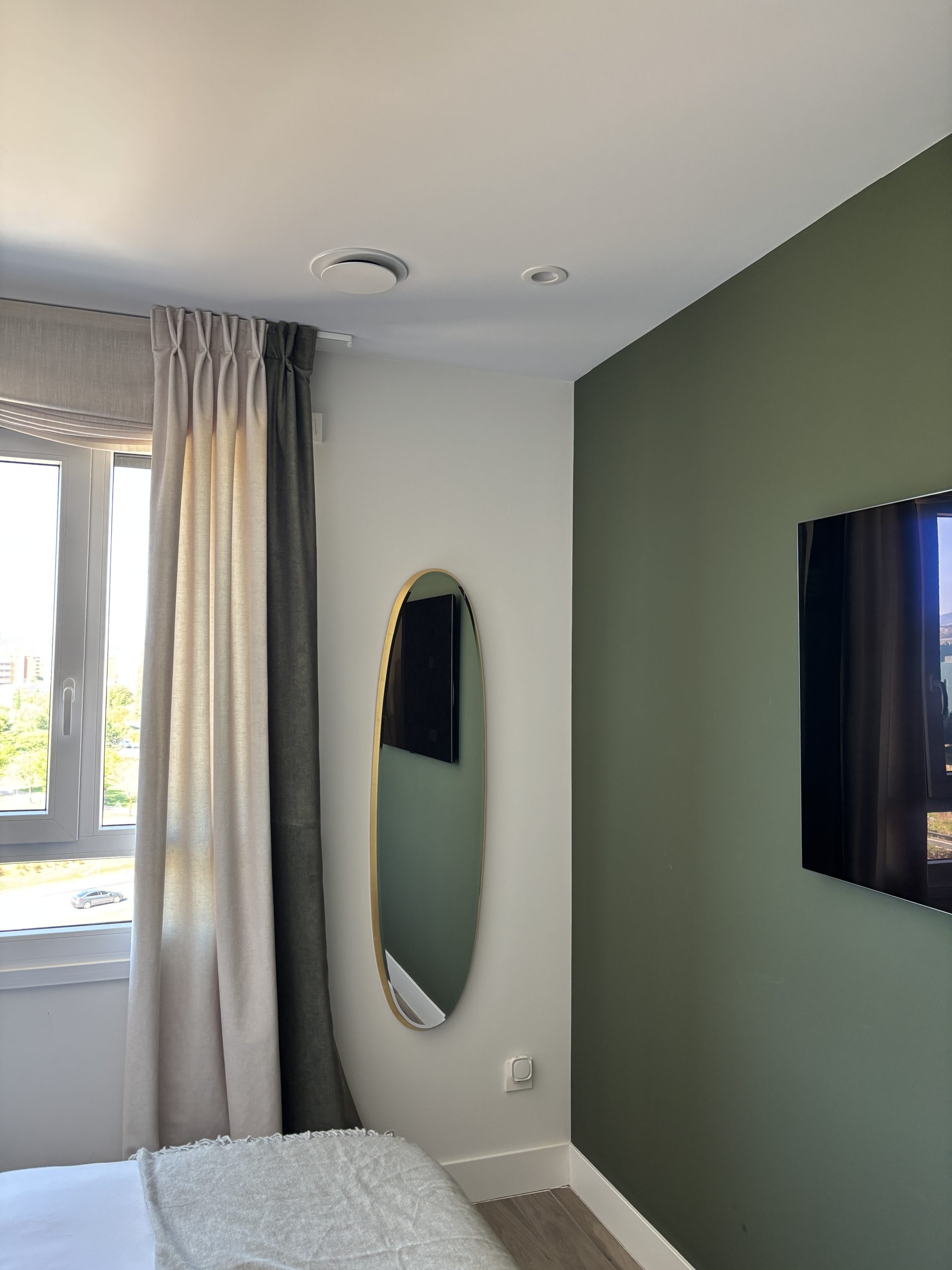 El cabecero en tono verde musgo aporta textura y carácter, contrastando con la pared en líneas verticales suaves.